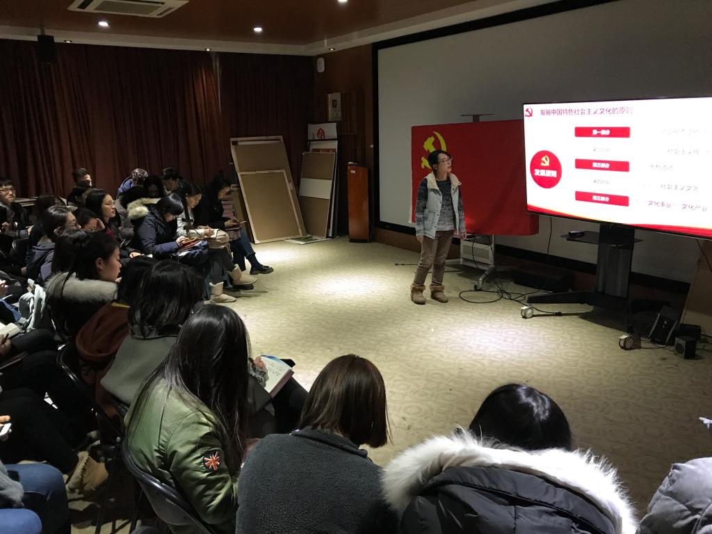 李嘉琪同学围绕“文化”这一关键词,从“中国特色社会主义文化基本情况”、“发展中国特色社会主义文化的原则”、“做中国特色社会主义文化的创造者与传播者”等三个方面,向党员和积极分子们讲解十九大报告中关于文化部分的内容。十九大报告中指出,坚定文化自信,推动社会主义文化繁荣兴盛。文化是一个国家、一个民族的灵魂。文化兴国运兴,文化强民族强。没有高度的文化自信,没有文化的繁荣兴盛,就没有中华民族伟大复兴。要坚持中国特色社会主义文化发展道路,激发全民族文化创新创造活力,建设社会主义文化强国。
