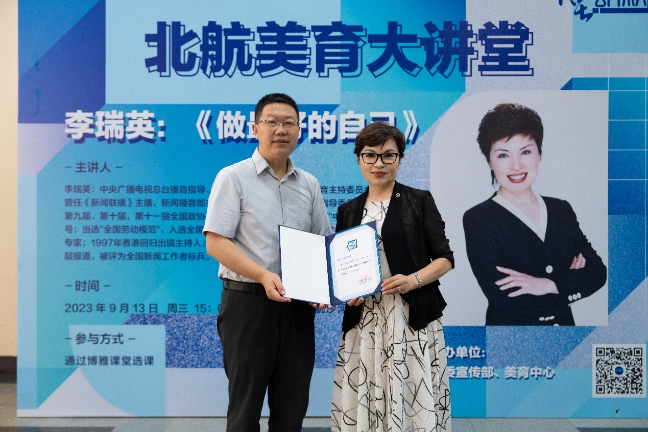 9月13日下午,北航美育中心特邀中央广播电视总台播音指导、国家广电总局中广联合会播音主持委员会会长、《新闻联播》原主播李瑞英做客北航大讲堂,为师生带来“做最好的自己”美育主题讲座,本次讲座由北航美育中心井志伟老师主持,美育中心主任兼新媒体艺术与设计学院院长沈旭昆教授致欢迎辞。现场400余名师生聆听了讲座。