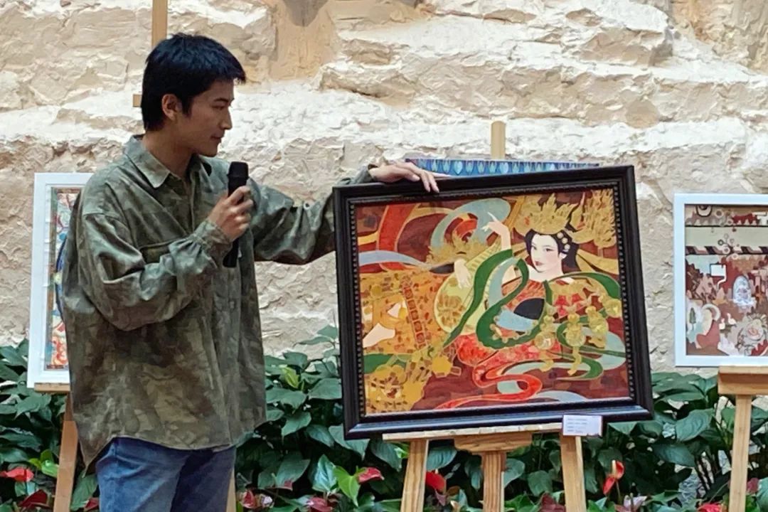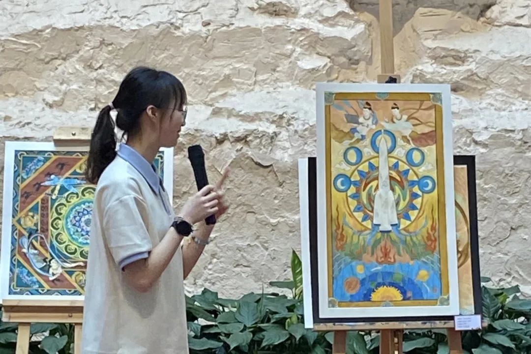 紧接着,杨紫絮、左政轩、张贺、秦尔仪同学分别分享了他们在创作民间绘画作品时的思路与体会。四位同学在创作中将传统敦煌元素与现代航空航天主题相结合,他们通过深入研究和巧妙运用AIGC技术,找到了富有自身特点的方案。杨紫絮同学选择克孜尔壁画为底表现航天发展历史,左政轩同学借鉴敦煌妆容特点表达“飞天”主题,张贺同学将航天器结合应龙纹与玉器纹路,秦尔仪同学则将火箭与传统火焰纹样相融合。